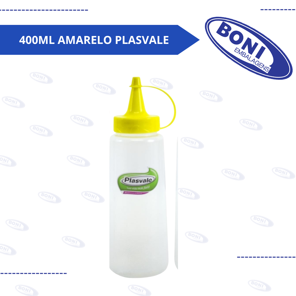 Bisnaga plástica de 400 ml na cor amarela, ideal para molhos, mostarda, ketchup e temperos. Fabricada pela Plasvale, possui tampa rosqueável com bico dosador, resistente e fácil de manusear.