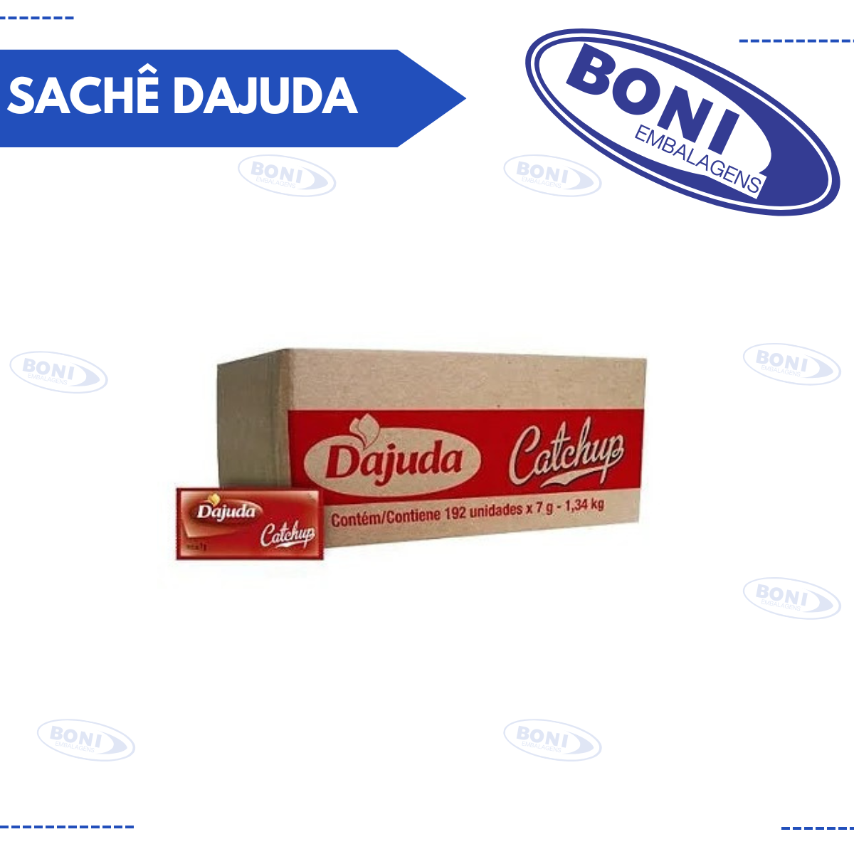 "Catchup Sachê Dajuda 192x7g" parece ser uma embalagem contendo sachês individuais de catchup da marca Dajuda, onde cada sachê possui 7 gramas de catchup. Essa embalagem é útil para uso individual em lanches, refeições ou para viagens. A quantidade de 192 sachês pode ser conveniente para estabelecimentos comerciais, como restaurantes, lanchonetes ou cafeterias.