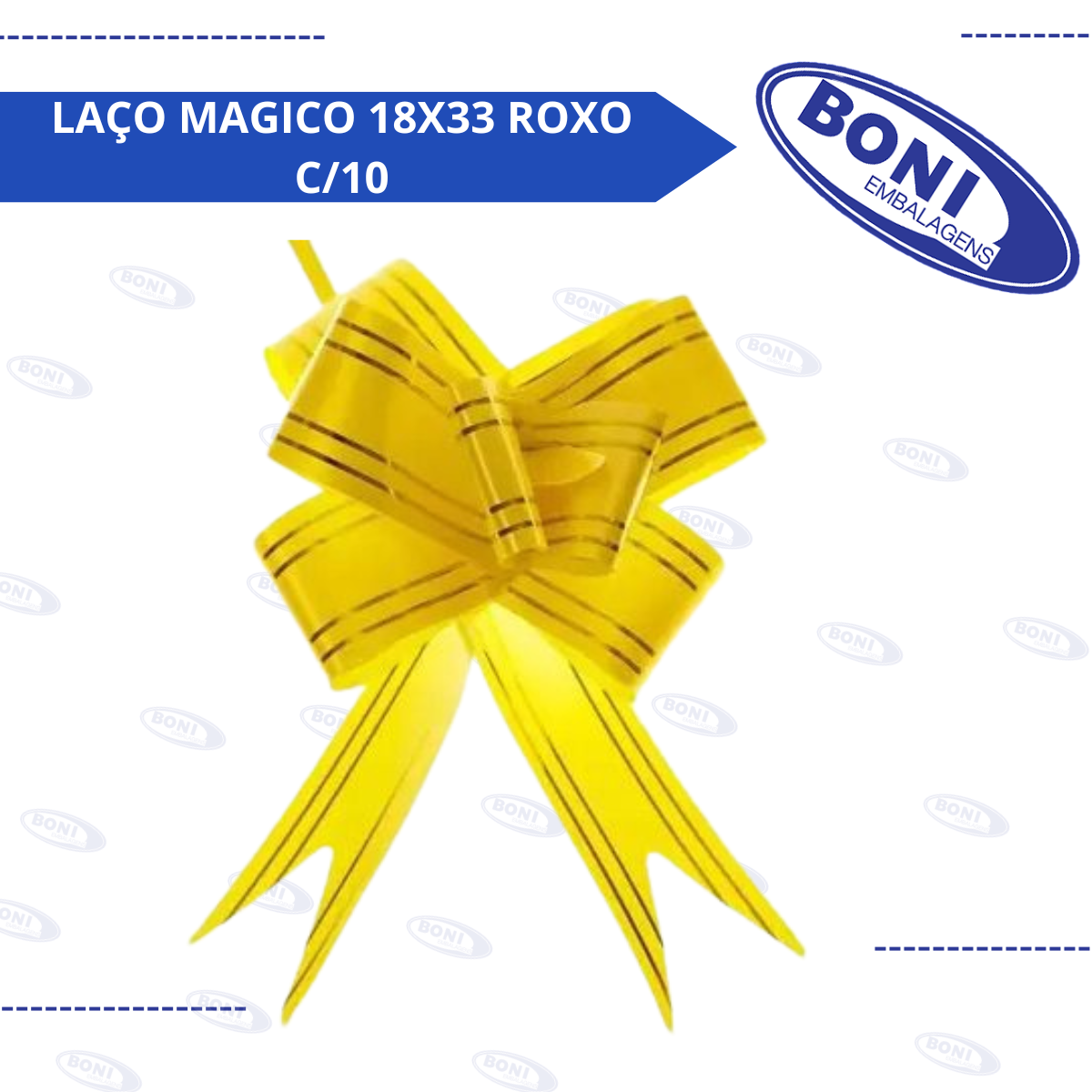 Laço mágico amarelo tamanho 30x47, perfeito para decorar presentes e embalagens. Basta puxar as fitas para formar o laço em segundos. Pacote com 10 unidades, ideal para festas, lembrancinhas e datas comemorativas.