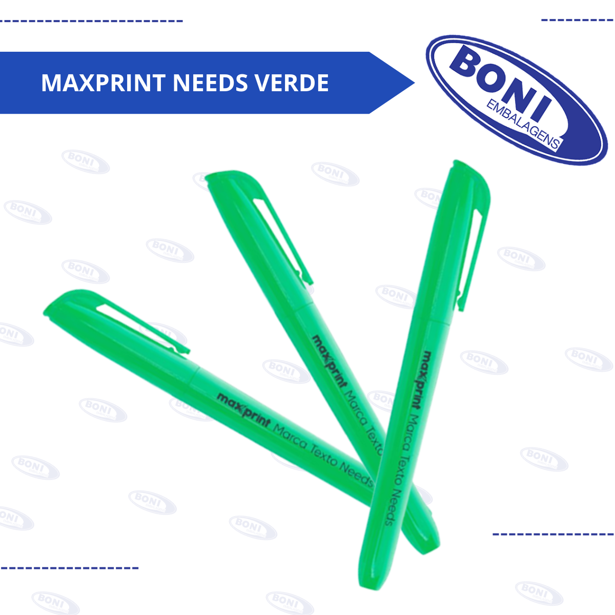 O Marca Texto Needs Verde Maxprint é uma caneta ideal para destacar textos com cor intensa e duradoura. Possui ponta chanfrada de 4mm, permitindo traços finos e grossos, e tinta atóxica à base de água. É vendido em unidades ou em kits com 12 canetas, dependendo do fornecedor.