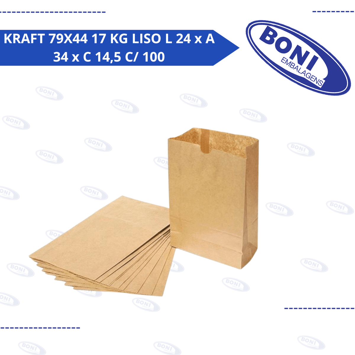O Saco de Papel Kraft 79x44 17kg Liso é um saco de boca aberta para embalagem, com capacidade para 17kg de produtos, como farinhas, grãos ou cimento. As medidas de 79x44 cm correspondem à boca e ao comprimento do saco, com o formato L 24 x A 34 x C 14,5 cm para sacolas de papel, conforme o contexto do e-commerce. O kit vem com 100 unidades.